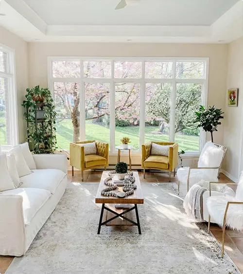 Multiple white couches and ottomans create tons of seating, which is perfect for hosting.