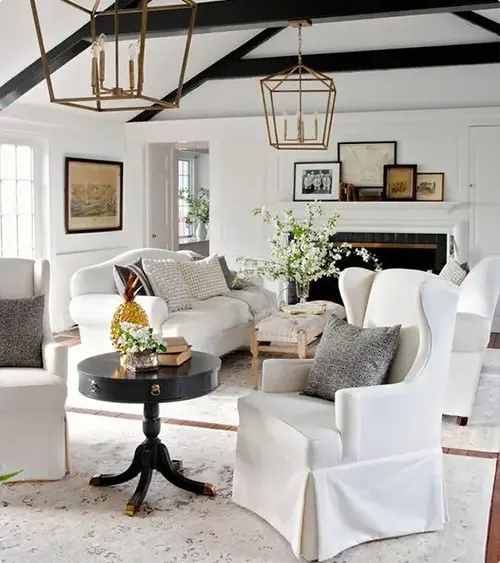 Exposed black beams across the ceiling are so dramatic. They create contrast and make the white walls feel even brighter.