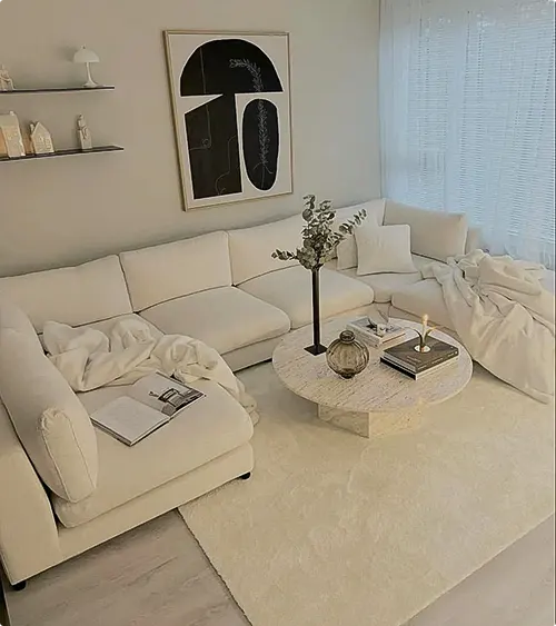 That oversized black and white art piece adds just enough contrast. It’s simple but striking, which is exactly what this room needs.