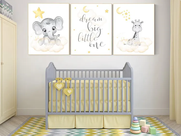 Soft yellow walls create a calm backdrop for a trio of animal prints above the crib.