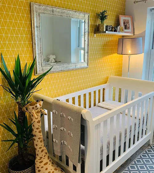 Geometric yellow wallpaper with a honeycomb pattern adds texture and interest to a nursery wall.