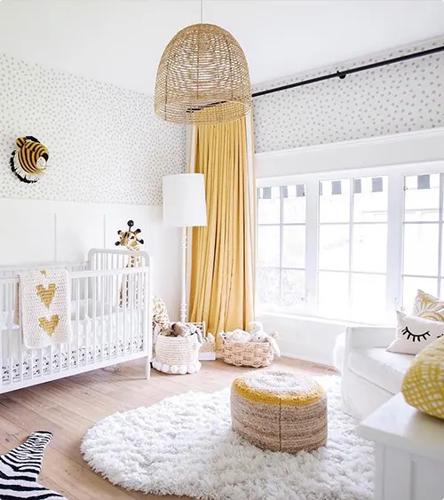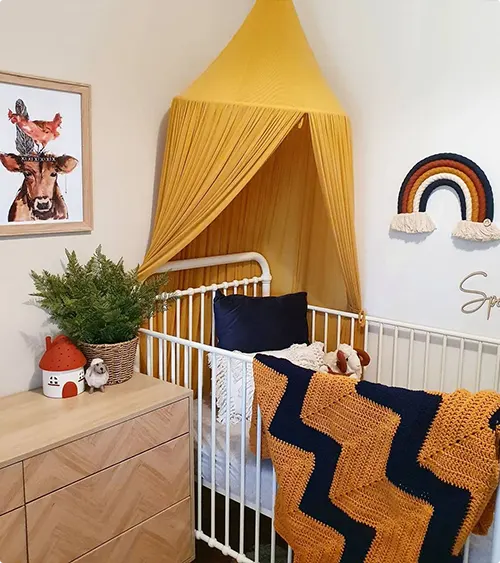 A mustard yellow canopy over a white crib creates an instant cozy corner.