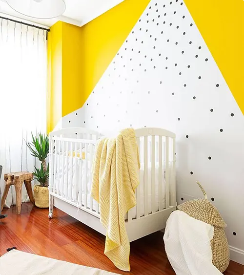 Paint a geometric accent wall using yellow, gray, and white triangles for a modern nursery.