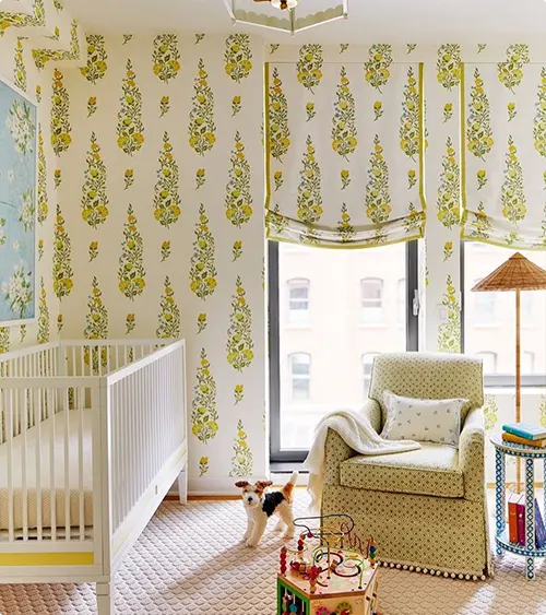 Yellow floral wallpaper with matching roman shades creates a pulled-together, traditional nursery look.