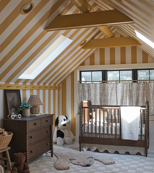 This attic nursery uses mustard and white stripes to make the vaulted ceiling feel less overwhelming.