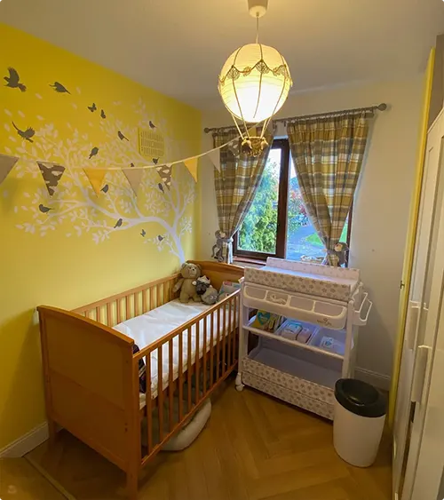 Bright yellow walls can feel risky, but when you add a tree mural with birds, it suddenly makes sense.