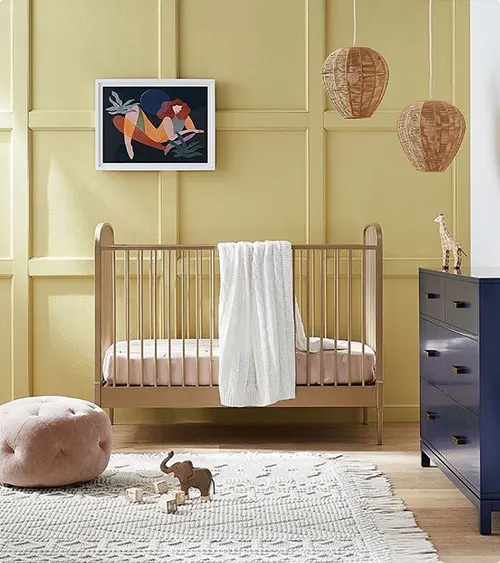 Keep it minimal with pale yellow walls, a wood crib, and one piece of abstract art.