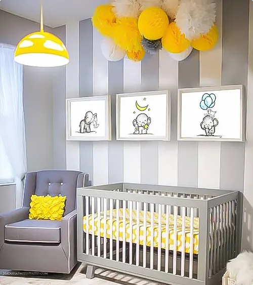 Gray and white striped walls are a safe choice, but yellow pom pom decorations make them fun.